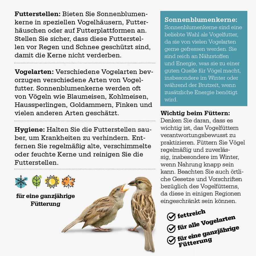 Hoher Fettgehalt: Sengers Sonnenblumenkerne enthalten einen hohen Anteil an gesunden Fetten, insbesondere ungesättigten Fettsäuren. Diese liefern den Vögeln die notwendige Energie, um ihre Aktivitäten aufrechtzuerhalten, insbesondere während der kalten Wintermonate.