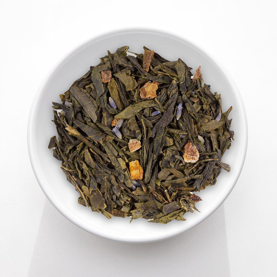 Senger’s Grün-Tee Blue Island – Eine erfrischende Sencha-Mischung mit Mango, Grapefruit, Mandarine und feinen Lavendelblüten. Leicht, fruchtig und belebend.