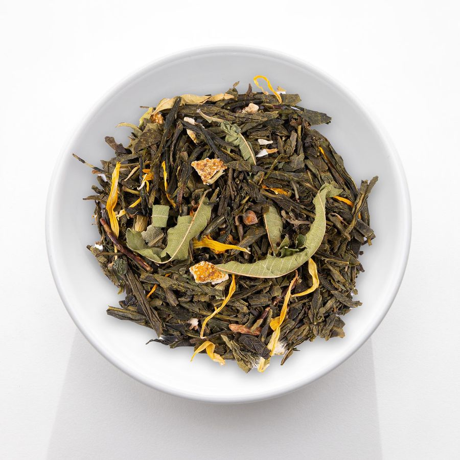 Senger’s Grün-Tee Mandarine Sunset – Mild-aromatischer China Sencha mit spritziger Mandarine, Zitrusnoten und feinen Blüten. Fruchtig, sonnig und belebend.